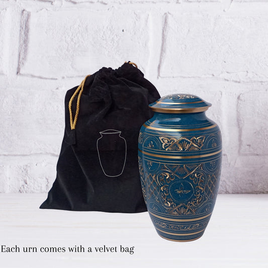 Solid Brass Etched Large Adult Cremation Urn for Human Ashes — With Velvet Bag
