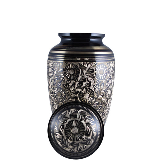 Solid Brass Flower Etched Large Adult Cremation Urn for Human Ashes — With Velvet Bag