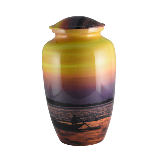 Sunset Orange & Yellow - Man in a boat rowing Urn for Ashes Adult male - Urns for human ashes adult female - Beautiful Orange/Yellow sunset