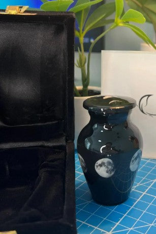 These handmade keepsakes have lunar phases of the moon and are a beautiful tribute for your loved one. They are made of aluminum and are of premium quality. The cap/lid also shows the moon in some phases.